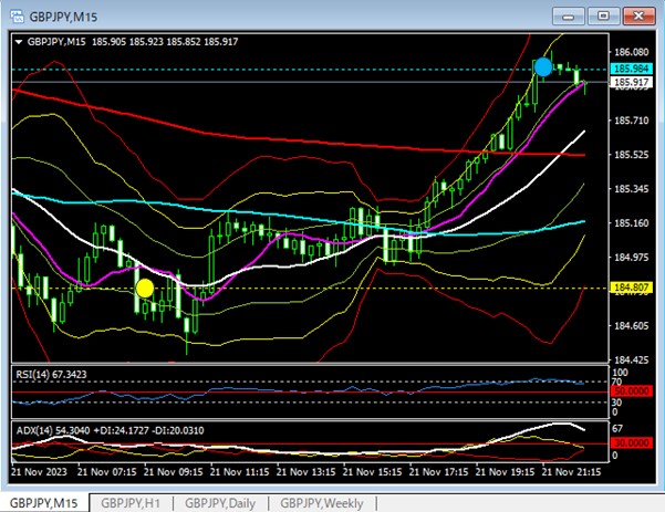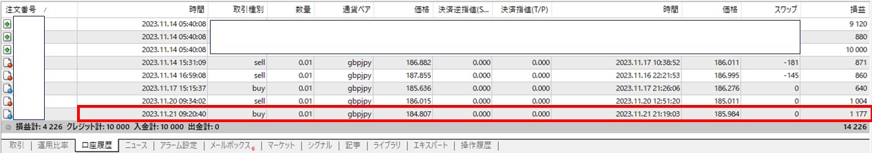 反転しそうなので「2023年11月21日 09:20:40(MT4時間)」に「0.01(1000通過)」「184.807」「買い」でトレードしました。その時の「チャート」がこちらです。
