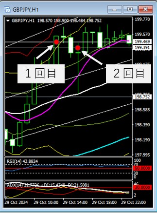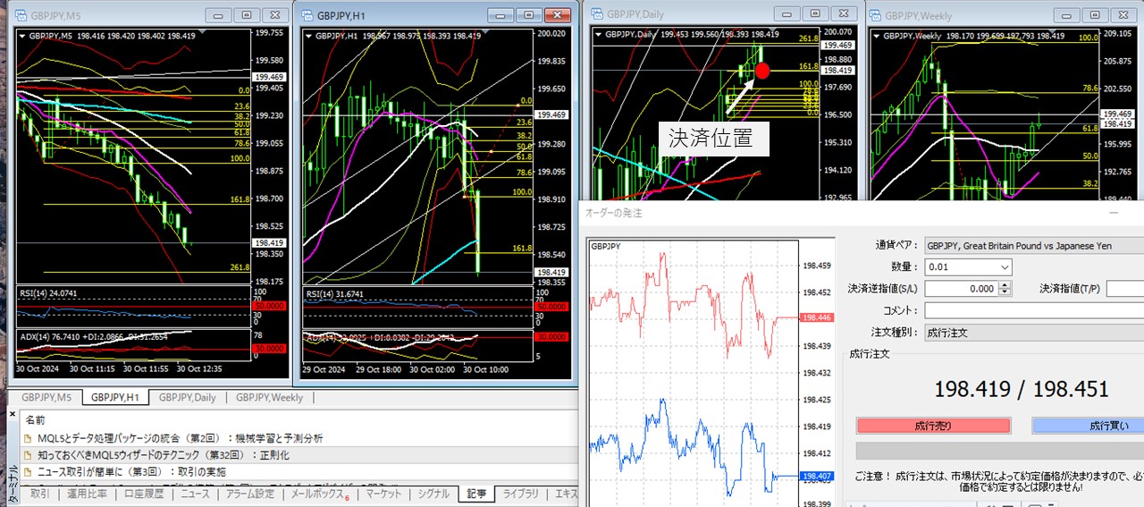 少し下降後、反転して来たので「2024年10月29日23時51分」に「199.391」で「売り」でトレード。(決済させようと戻って来ますが、多くの場合その後、来た方向に戻る事が多いので)