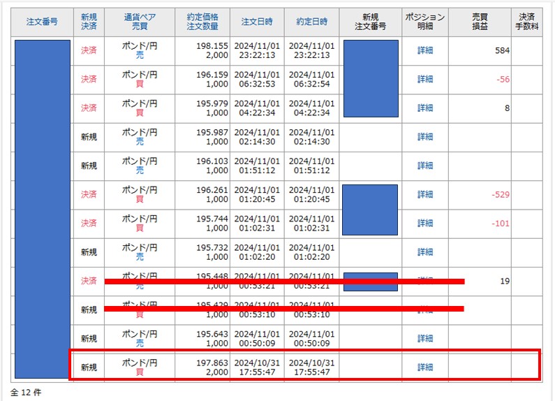 「2024年11月1日 00時50分」「195.643」「1000通過」の「売り」でトレードしました。
