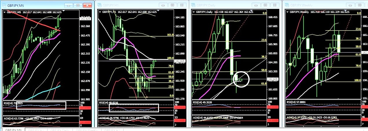 左から「5分足」「1時間足」「日足」「週足」になっています。