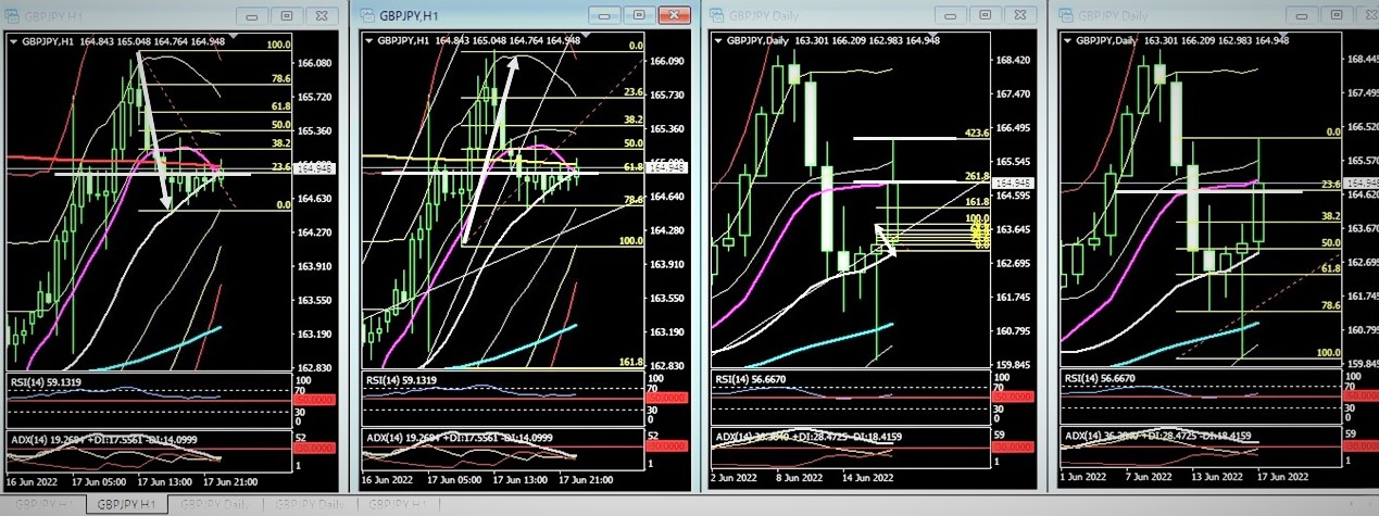 左端の「1時間足」は「上から下に」「Fibo」が引いて有ります。