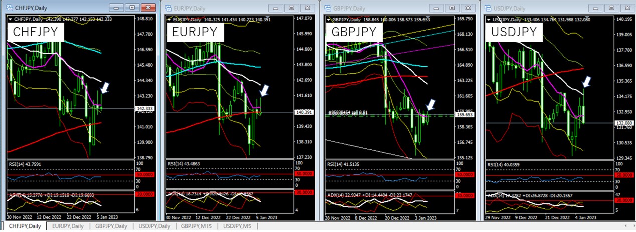 今回は、左から「CHFJPY」「EURJPY」「GBPJPY」「USDJPY」を表示しています。