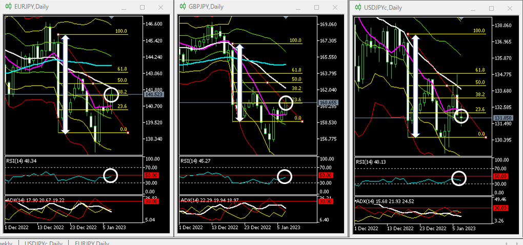 「3通貨」の「日足」の「Fibo」「23.6、38.2」、「RSI」「50」に注目したいと思います。