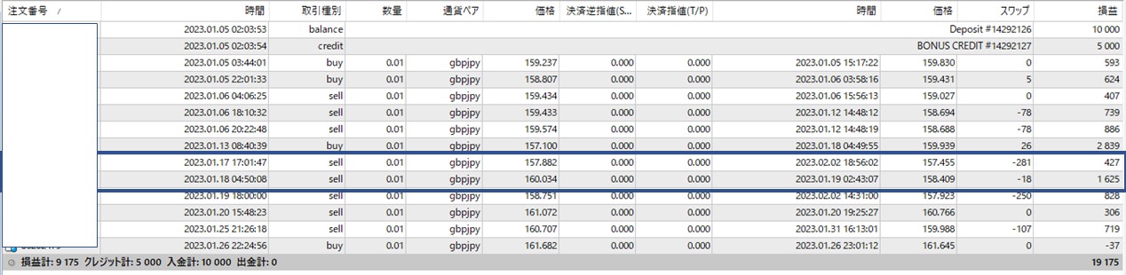 現在「買い」トレードを「決済」して「売り」トレードを「160.034」で入れてあり、2件の「売り」だけが有ります。