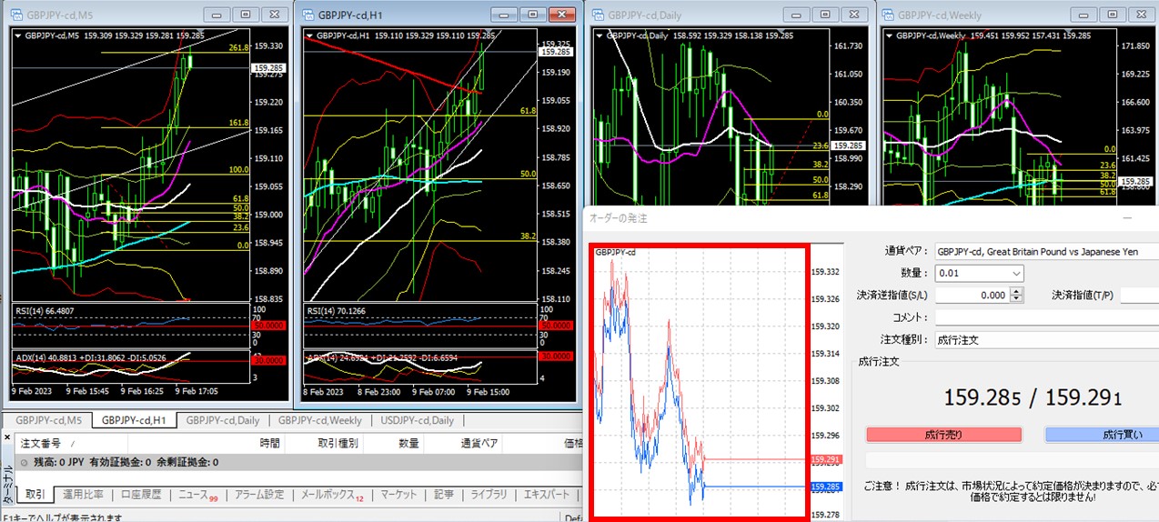 「オーダーの発注」を表示して、「5つ」のチャートでトレードする(赤枠部分)。