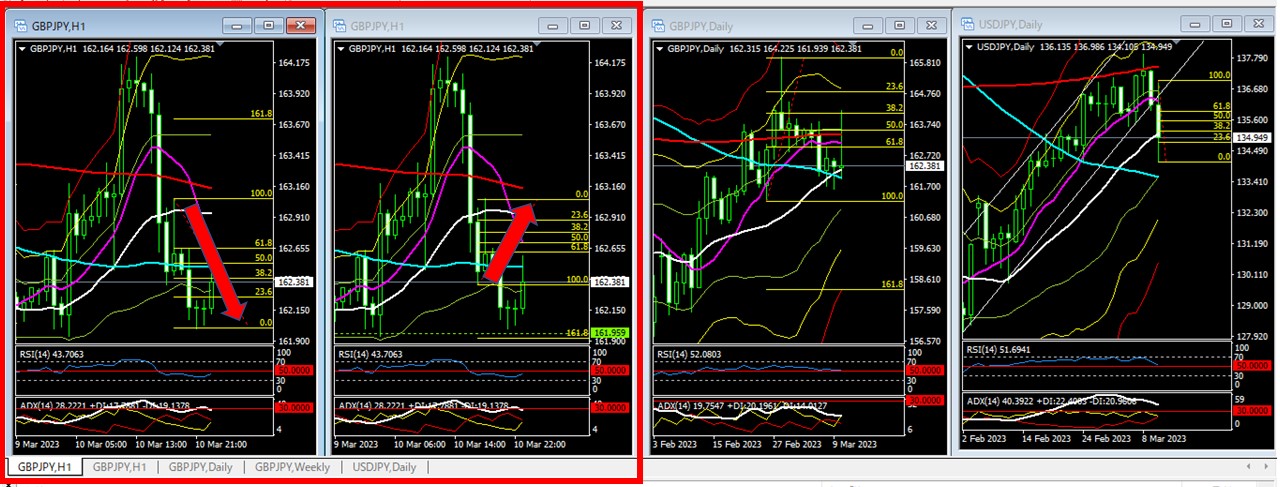 同じ「1時間足」を表示(赤枠)して、左は「左上から右下に引いた普通のFibo」右は「左下から右上に引いた利確のFibo」を表示しています。