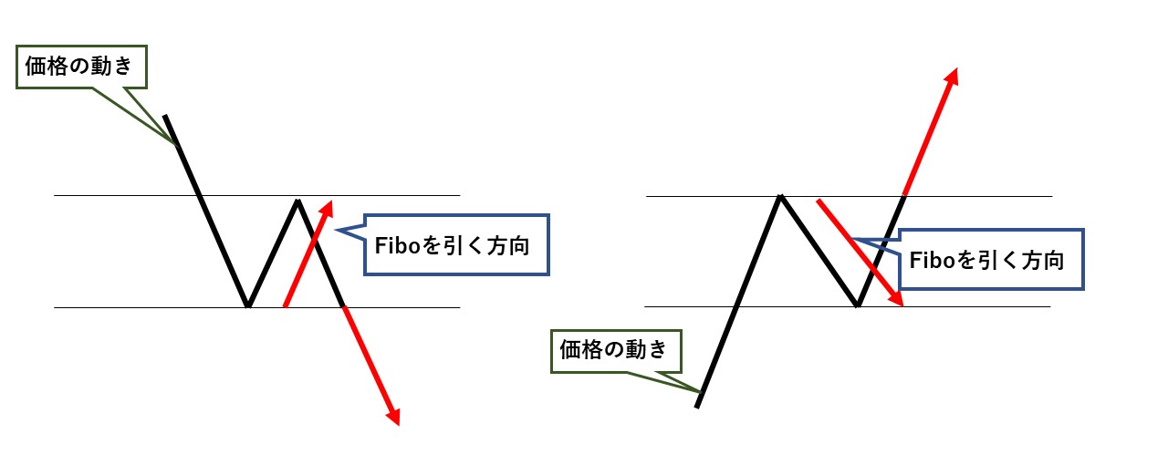 この「Fibo」を引く方法は、「ブレイクしそうな方向」から「反対方向」に引きます。
