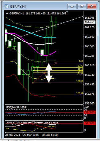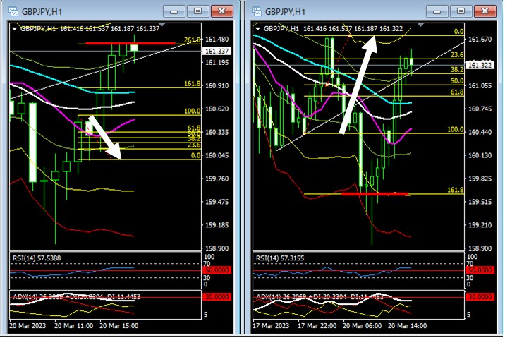 「161.8」をブレイクしたが、まだ伸びそうなので「261.8」まで「決済」を待って見ようなど利益を伸ばせます。