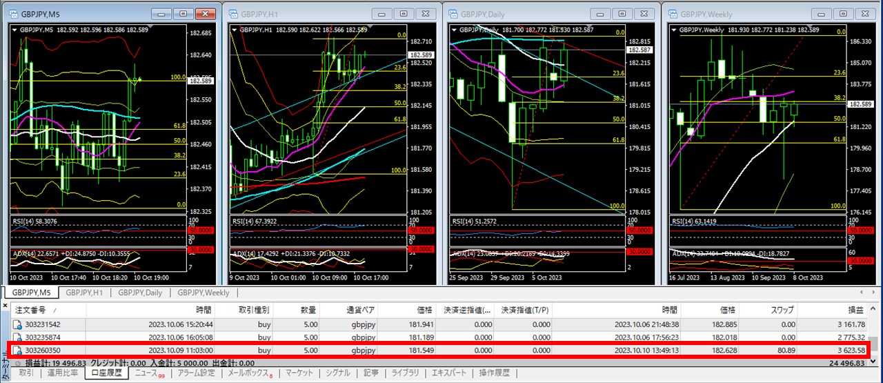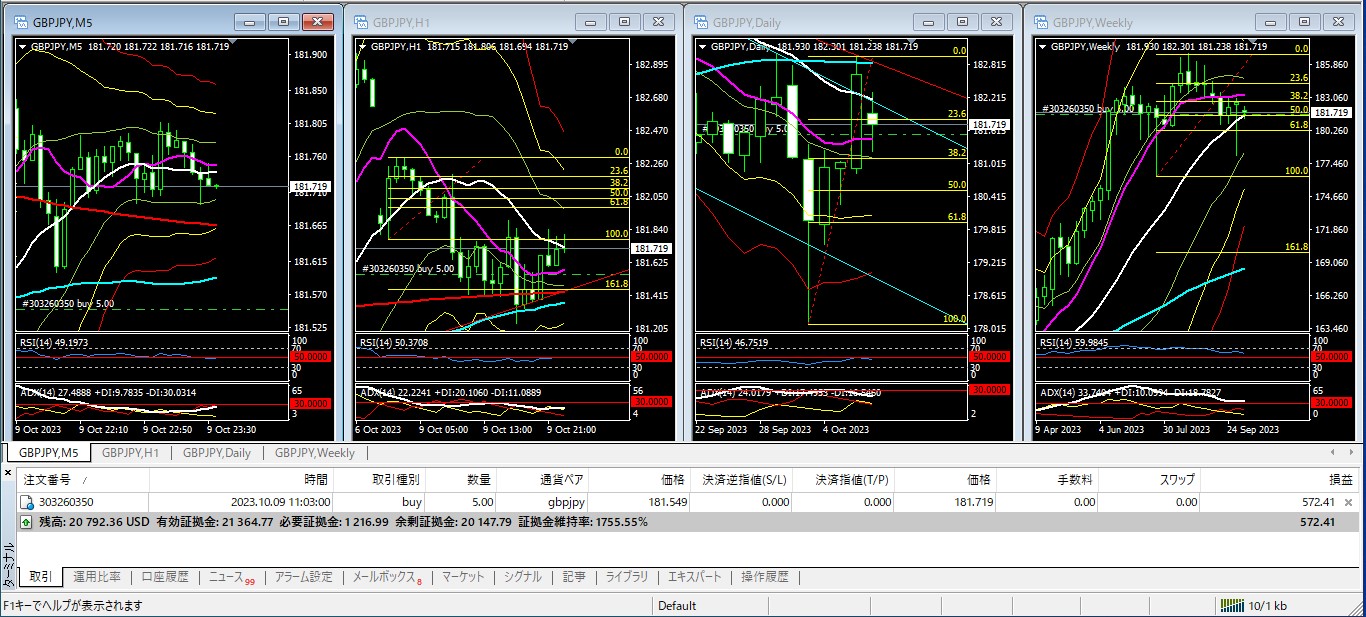 現在「2023.10.09 11:03:00」「ポンド円」「181.549」「買い」でトレードしています。